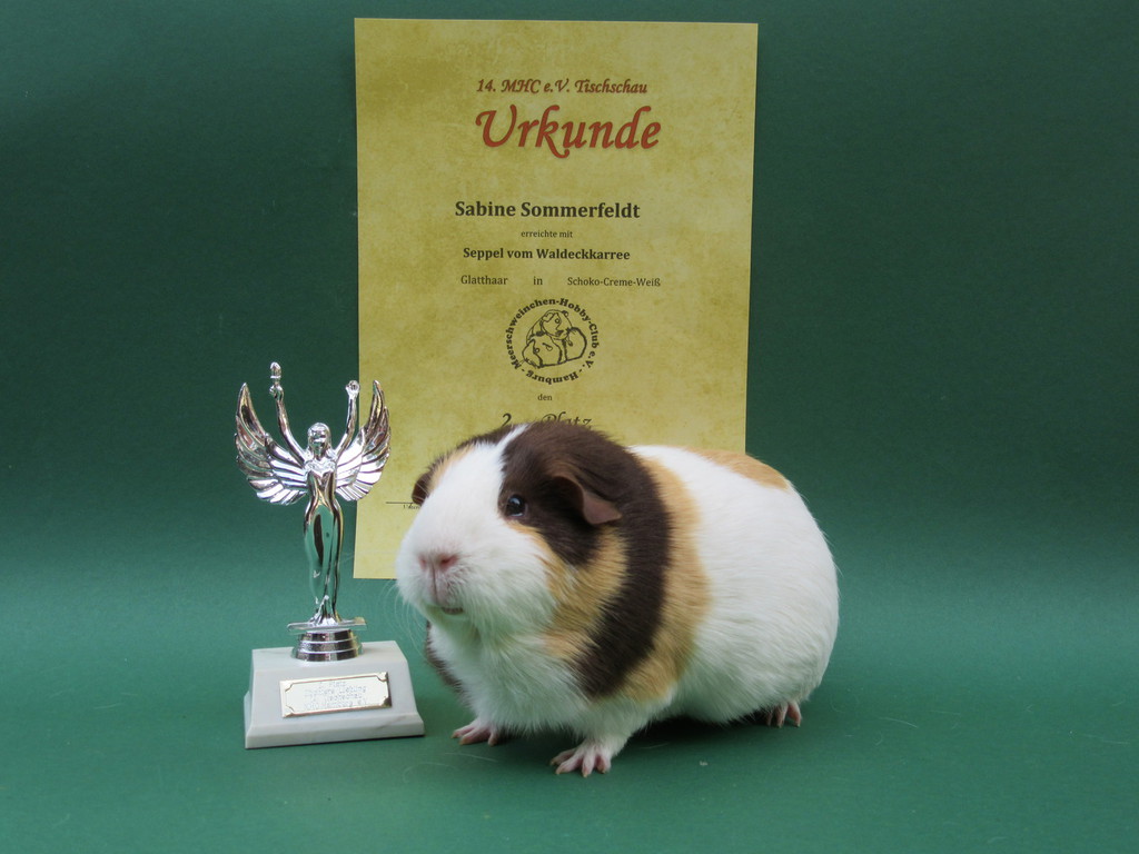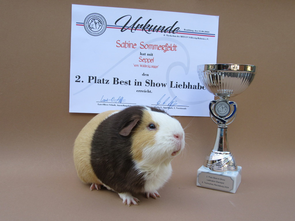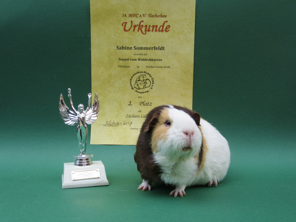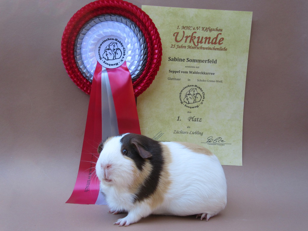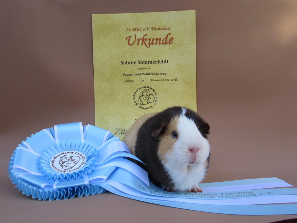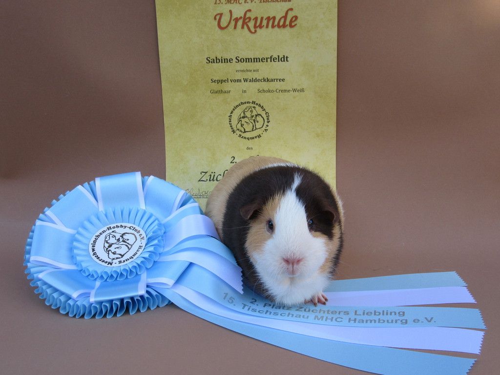 Seppel Glatthaar in Schoko - Creme - Weiß hat den 2. Platz als Züchters Liebling erreicht.