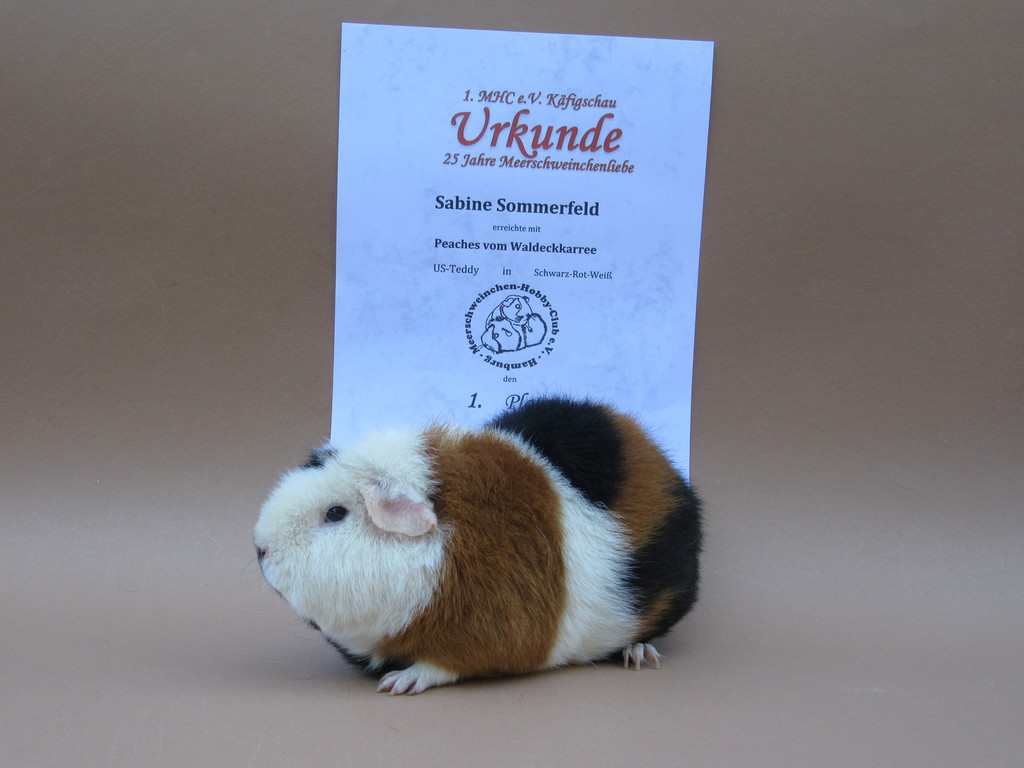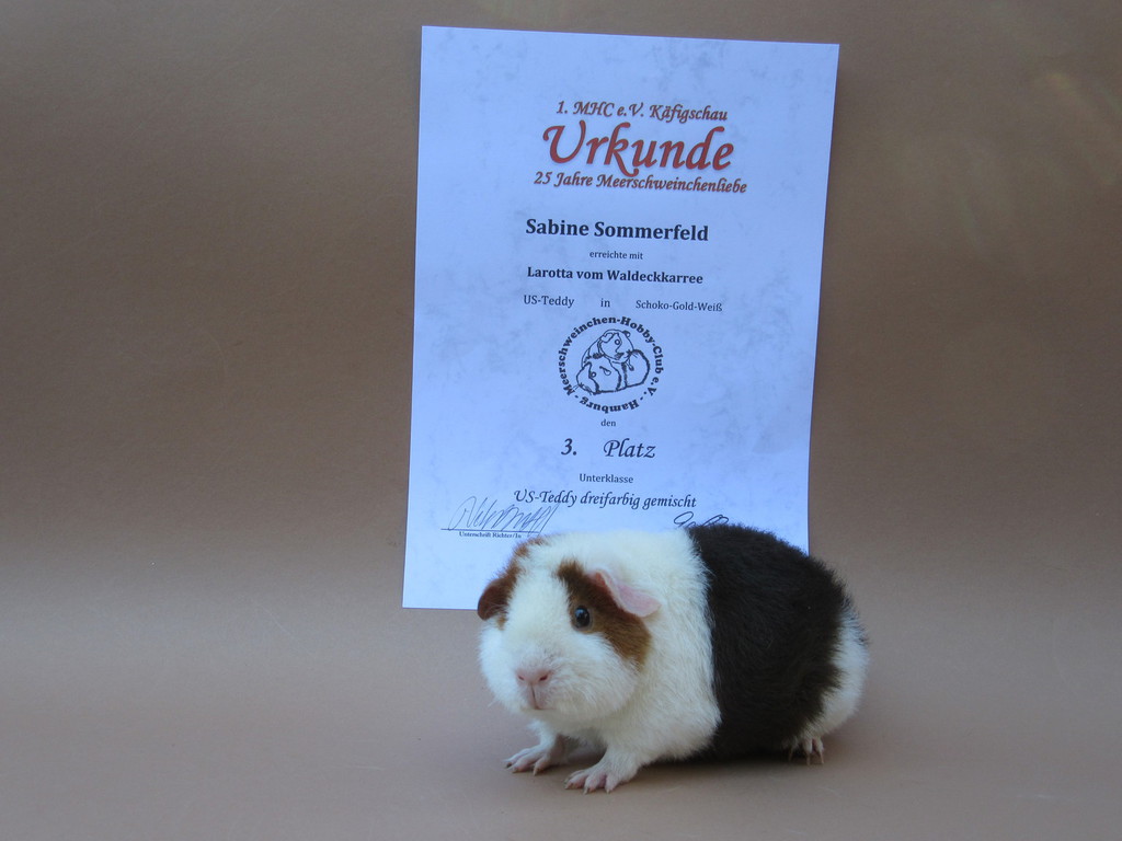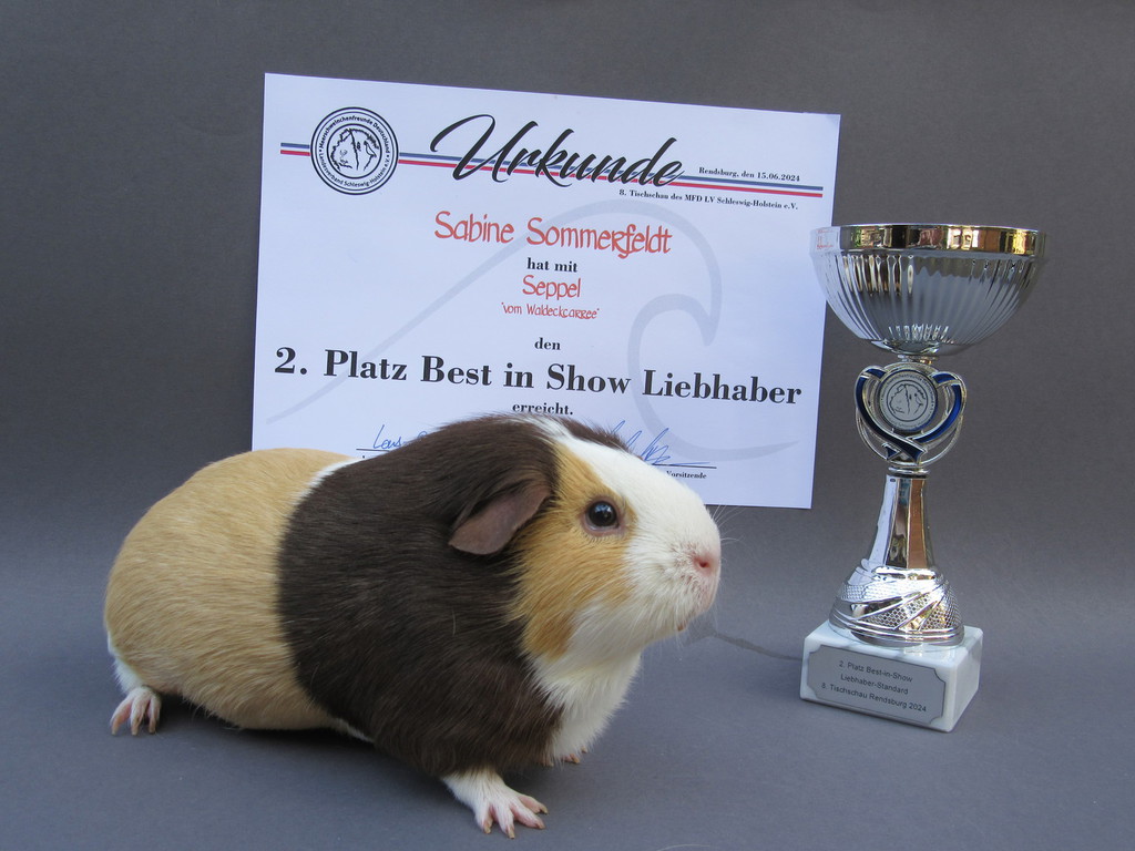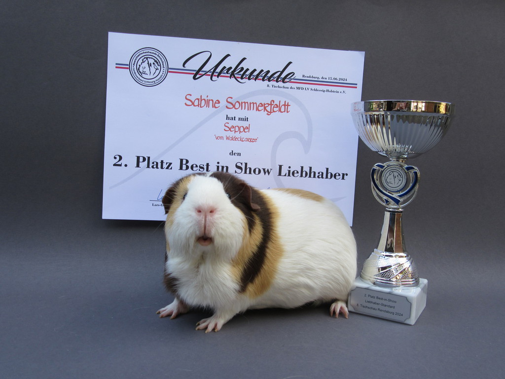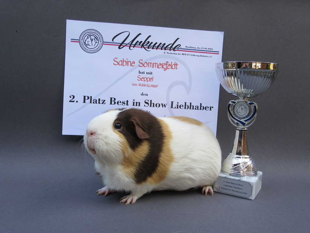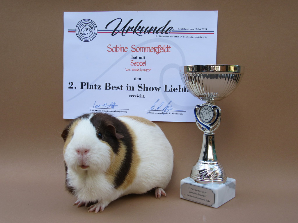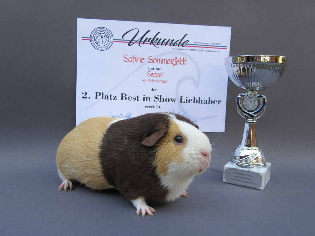 Seppel Glatthaar in Schoko - Creme - Weiß hat den 2. Platz als Züchters Liebling erreicht.